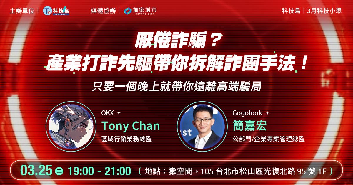 科技島(1111人力銀行旗下科技媒體)於 3/25(二)挑戰了時下最熱門的 「詐騙」議題,融合了區塊鏈+社群常見的詐騙手法和破解方法,知名區塊鏈金融機構 OKX 與 Gogolook 兩間在金融、打詐上有著豐富的經驗 (特別是幾乎人人手機內都有的 Whoscall 軟體